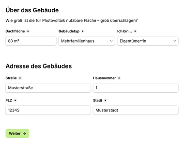 Zunächst trage bitte das Flurstück in die Karte ein. Dazu wird abgefragt, wie groß die Solaranlage auf Deinem Grundstück werden soll.
